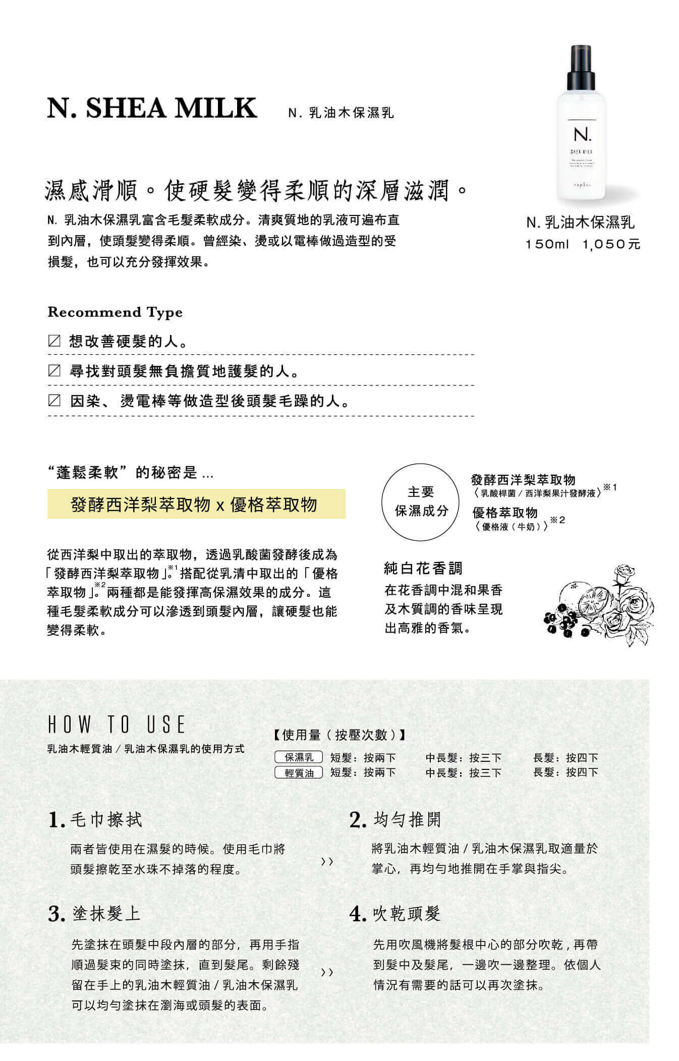 N.乳油木保濕乳富含毛髮柔軟成分。